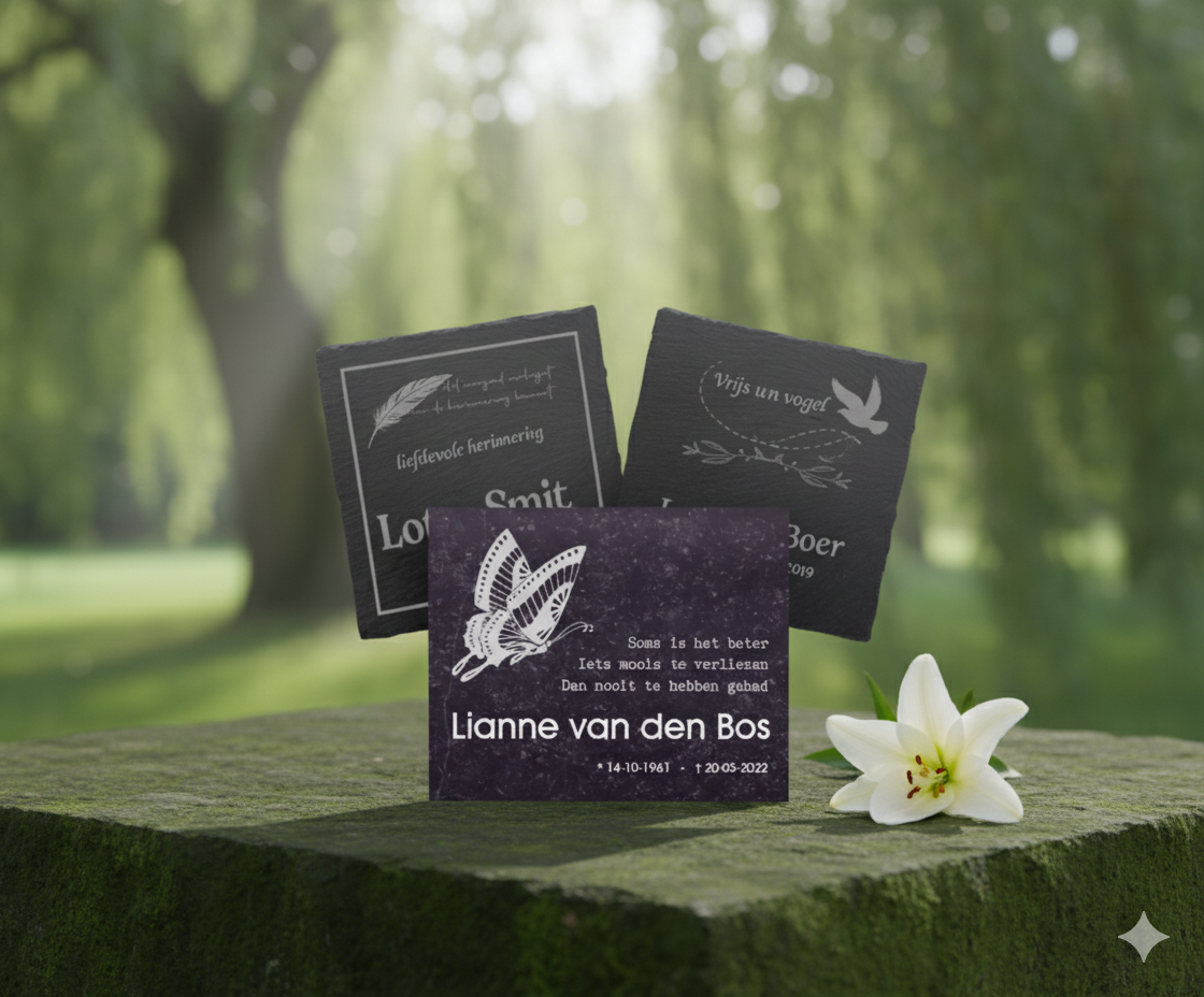 Voor een Tijdelijke of Blijvende Rustplaats: Of u nu een plaat zoekt voor een urnenmuur, een boom bij een natuurbegraafplaats of een tijdelijk gedenkteken bij een graf, onze diverse stijlen en materialen zorgen ervoor dat er altijd een passend ontwerp is dat recht doet aan de plek en de herinnering.