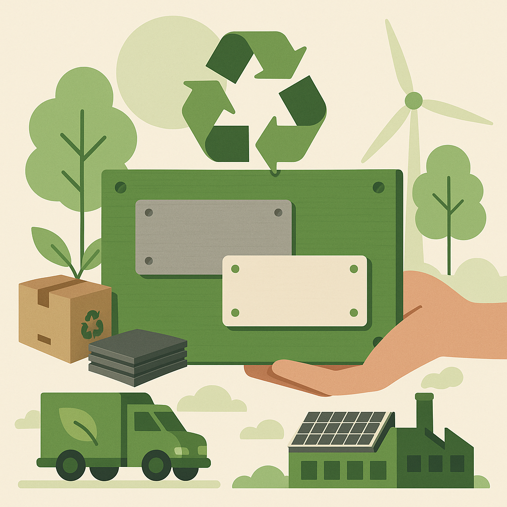 Onze volledige productie vindt plaats in Nederland, in onze eigen werkplaats. Dat is een bewuste keuze. Door lokaal te produceren, hoeven we geen gebruik te maken van lange, vervuilende internationale transportketens. Geen zeecontainers, geen luchtvracht, geen onnodige kilometers. Dit zorgt voor een aanzienlijk lagere CO₂-uitstoot per naamplaat en een veel kortere levertijd voor onze klanten.