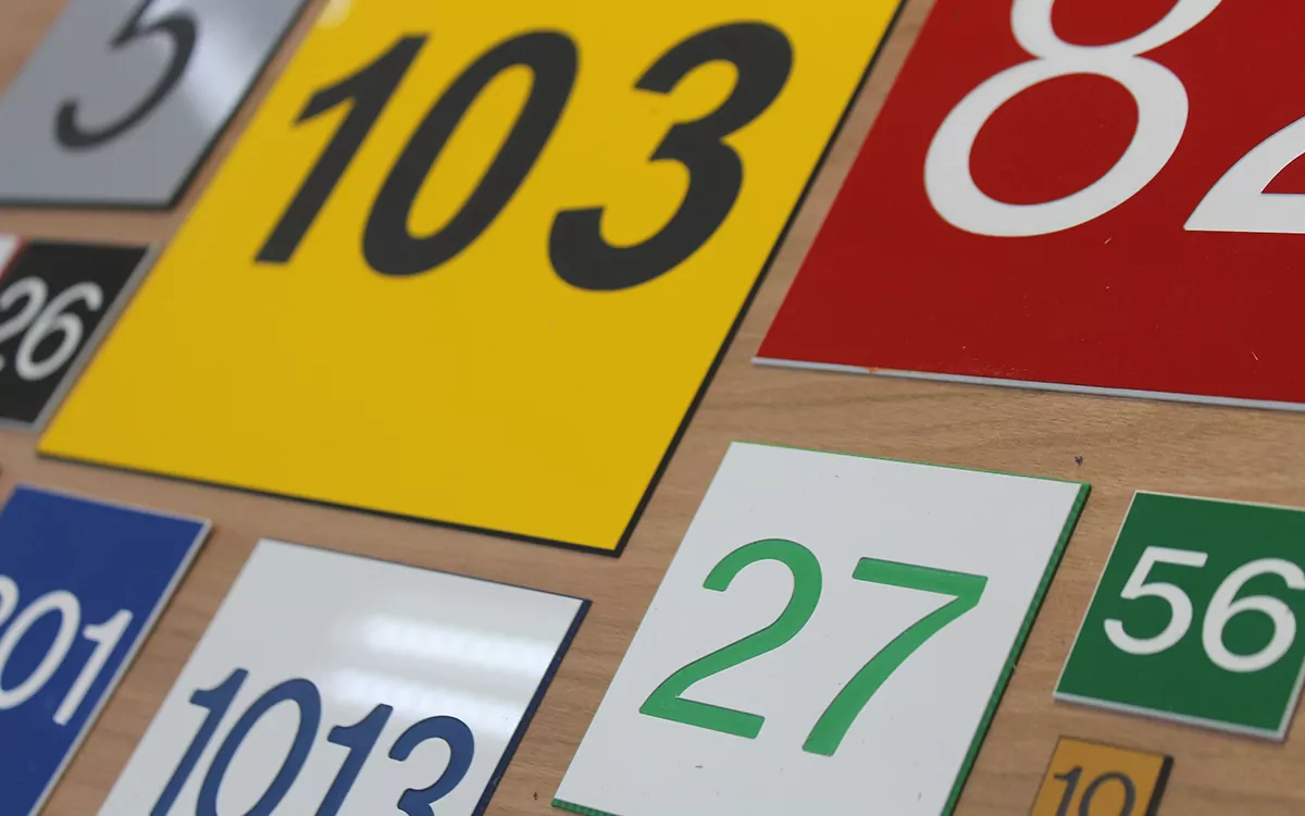 Wij graveren de cijfers (en letters) uit de bovenste laag weg, waardoor de onderste laag (in een andere kleur) zichtbaar wordt! Resultaat is een onverwoestbaar basic plaatje. Daarna wordt de plaat voorzien van afstandhouders, zelfklevend tape of gaatjes. Dit is afhankelijk van het product en jouw keuze. Deze bordjes worden vaak in grote oplagen geleverd aan de woningbouw, zoals VvE's en bouwbedrijven.