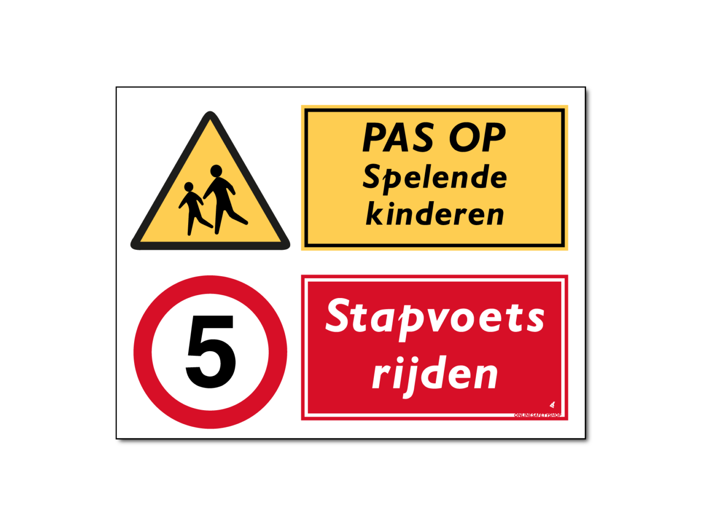 Met het opvallende combinatiebord “Pas op! Spelende kinderen” en “Stapvoets rijden” zorgt u voor een veilige omgeving voor spelende kinderen. Dit veelzijdige bord combineert twee belangrijke waarschuwingen in รฉรฉn, waardoor het ideaal is voor gebieden waar kinderen spelen en verkeer aanwezig is. Het waarschuwingsbord trekt de aandacht van weggebruikers en herinnert hen eraan om extra voorzichtig te zijn en hun snelheid te verminderen. Kies voor dit combinatiebord om de veiligheid van spelende kinderen en verkeersdeelnemers te waarborgen.