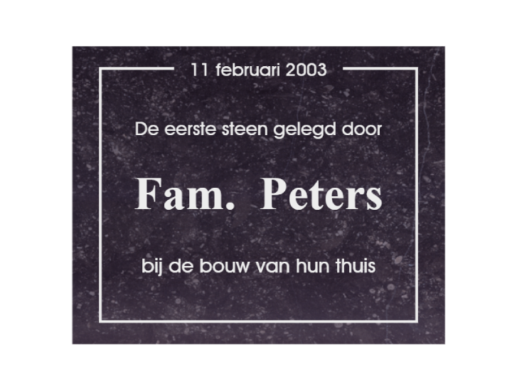 Bij MijnNaamplaat.nl geloven we in het vieren van belangrijke gebeurtenissen met stijl en elegantie. Onze “Eerste Steen” biedt een tastbare en blijvende herinnering aan speciale momenten, zoals de opening van een nieuw huis, bedrijf of een ander gedenkwaardig evenement.
