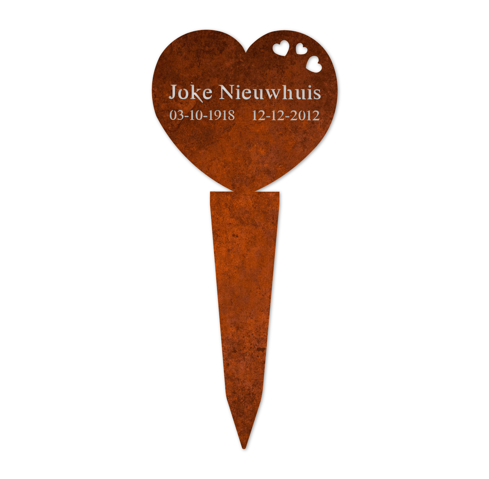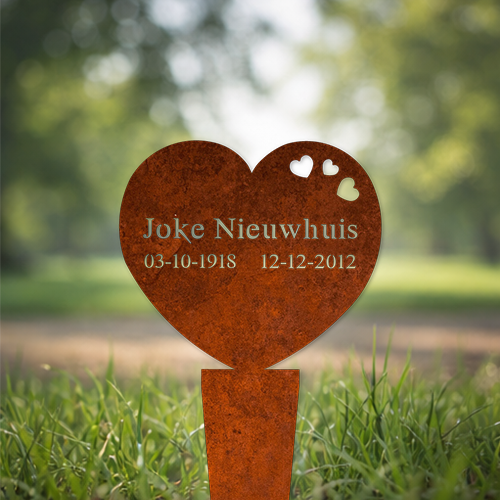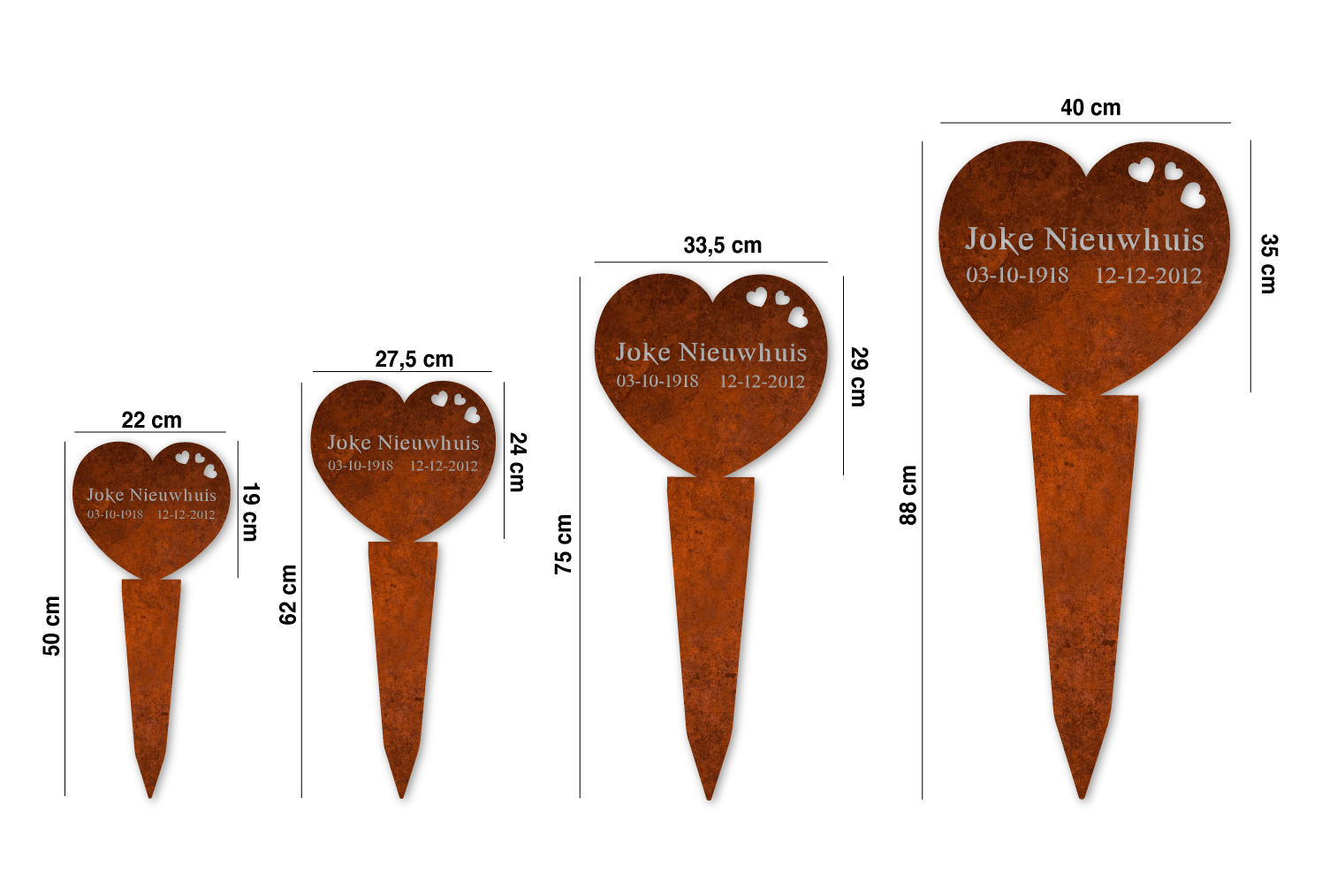 Elke hartvormige cortenstalen gedenkplaat wordt geleverd met een stevige, flexibele grondpen. Daarmee plaats je het monument eenvoudig in aarde of grind – en dankzij het weerbestendige materiaal blijft het jarenlang mooi.