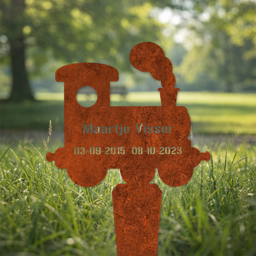 Ontdek onze bijzondere gedenkplaat van cortenstaal in de vorm van een trein – een liefdevol monumentje voor een kind. Voorzien van een buigzame grondpen, plaats je deze gedenkplaat eenvoudig en stevig op elke herdenkingsplek. Een eigentijdse en ingetogen manier om blijvend stil te staan bij een klein leven dat groot gemist wordt.