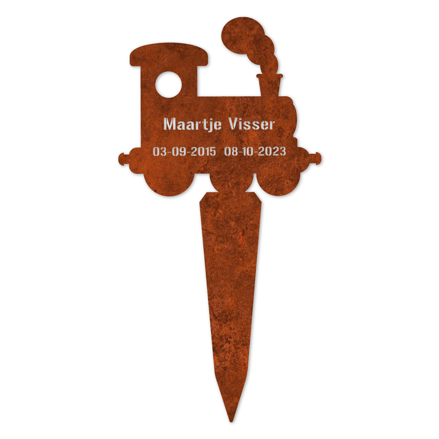 De treinvormige gedenkplaat wordt geleverd met een stevige, flexibele grondpen. Zo kan de plaat eenvoudig worden geplaatst in aarde of grind. Door het duurzame, weerbestendige materiaal blijft de herinnering ook in weer en wind zichtbaar – een blijvend eerbetoon, met liefde gemaakt.