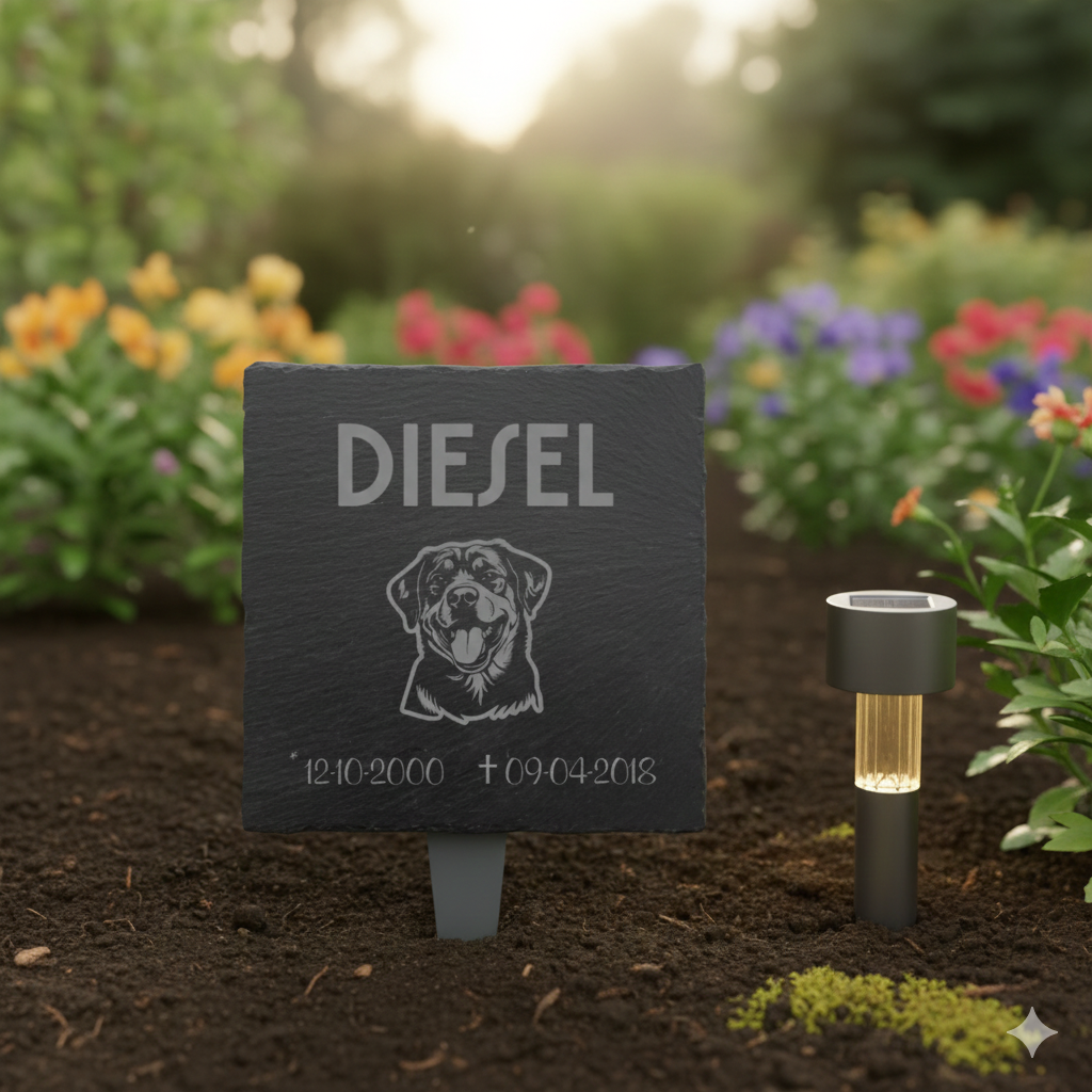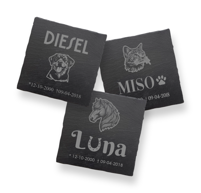 Het verlies van een huisdier laat een grote leegte achter. Om een blijvende en respectvolle herinnering te creëren, is een gedenkplaat van leisteen een natuurlijke en stijlvolle keuze. Onze dieren-gedenkplaten worden gemaakt van hoogwaardig leisteen en voorzien van een fijne lasergravure die jarenlang zichtbaar blijft. Ze bieden een serene en persoonlijke manier om je huisdier te herdenken, zowel binnen als buiten.