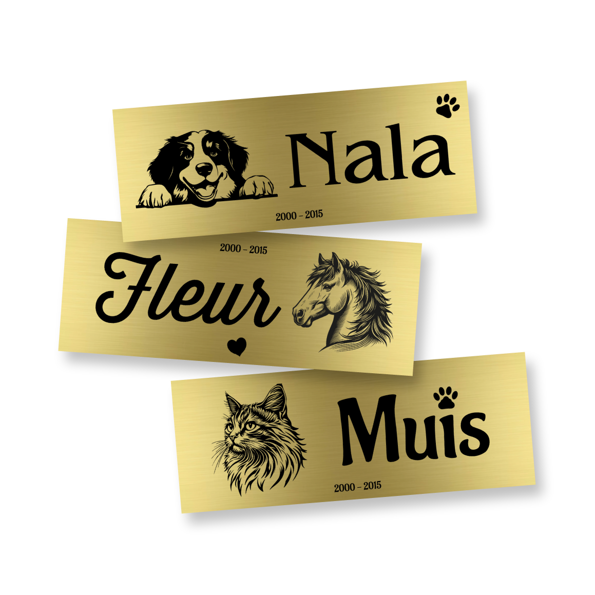 Een messing dieren-gedenkplaat is een stijlvolle, duurzame en persoonlijk te ontwerpen herinnering aan uw huisdier. Verkrijgbaar in diverse maten, haarscherp gelaserd en volledig naar wens samen te stellen.