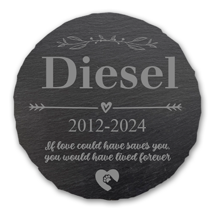 Onze ronde gedenkplaat van leisteen legt herinneringen op een tastbare en tijdloze manier vast. Je kiest uit drie formaten: 200 mm, 250 mm of 300 mm. Dankzij de natuurlijke uitstraling vormt elke gedenkplaat een stijlvol eerbetoon aan een dierbare.