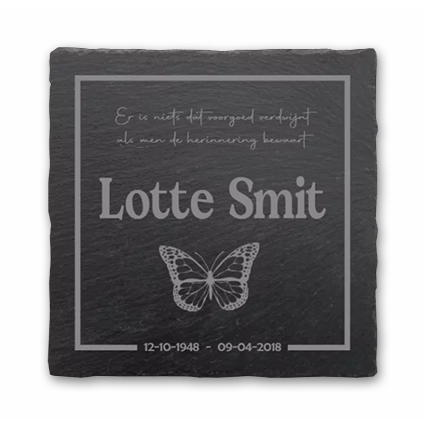Met een gedenkplaat van leisteen van MijnGedenksteen.nl geef je niet alleen een eerbetoon aan de herinnering, maar laat je ook je persoonlijke stijl zien. De naadloze combinatie van natuurlijke schoonheid en gepersonaliseerde lasergravure transformeert jouw gedenkplaat tot een uniek meesterwerk dat bezoekers in zijn ban houdt en de herinnering levendig houdt.
