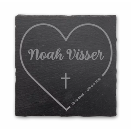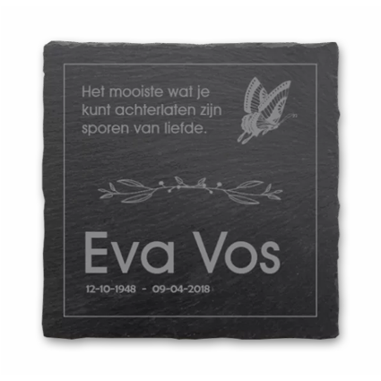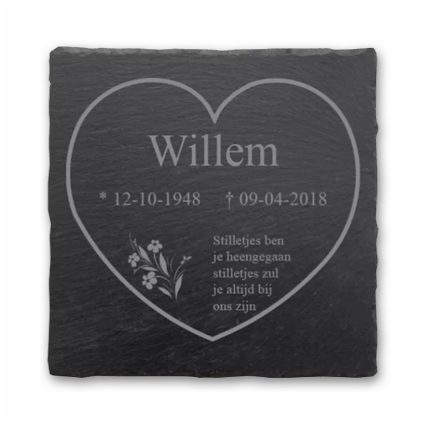 Leisteen, een kleisteen die door de natuur onder hoge druk is gevormd via een proces dat bekend staat als metamorfose, vormt de basis voor onze uitzonderlijke gedenkplaten. Het resultaat is een stevige en duurzame steen waarop we zorgvuldig jouw gewenste tekst laseren. De lasertechniek geeft de tekst een elegante grijswitte kleur, wat een vleugje verfijning toevoegt aan het algehele ontwerp.