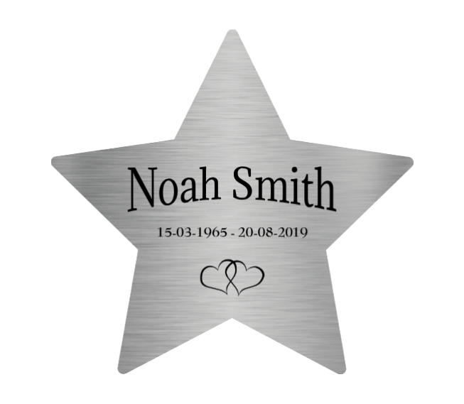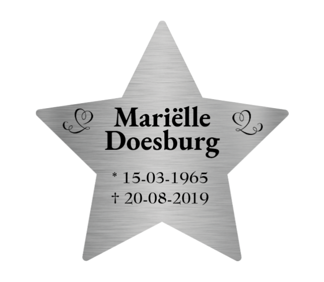 Een RVS Gedenkplaat in stervorm als blijvend symbool van licht en herinnering. Laat uw persoonlijke tekst haarscherp graveren en creëer een stijlvol eerbetoon voor mens of dier.