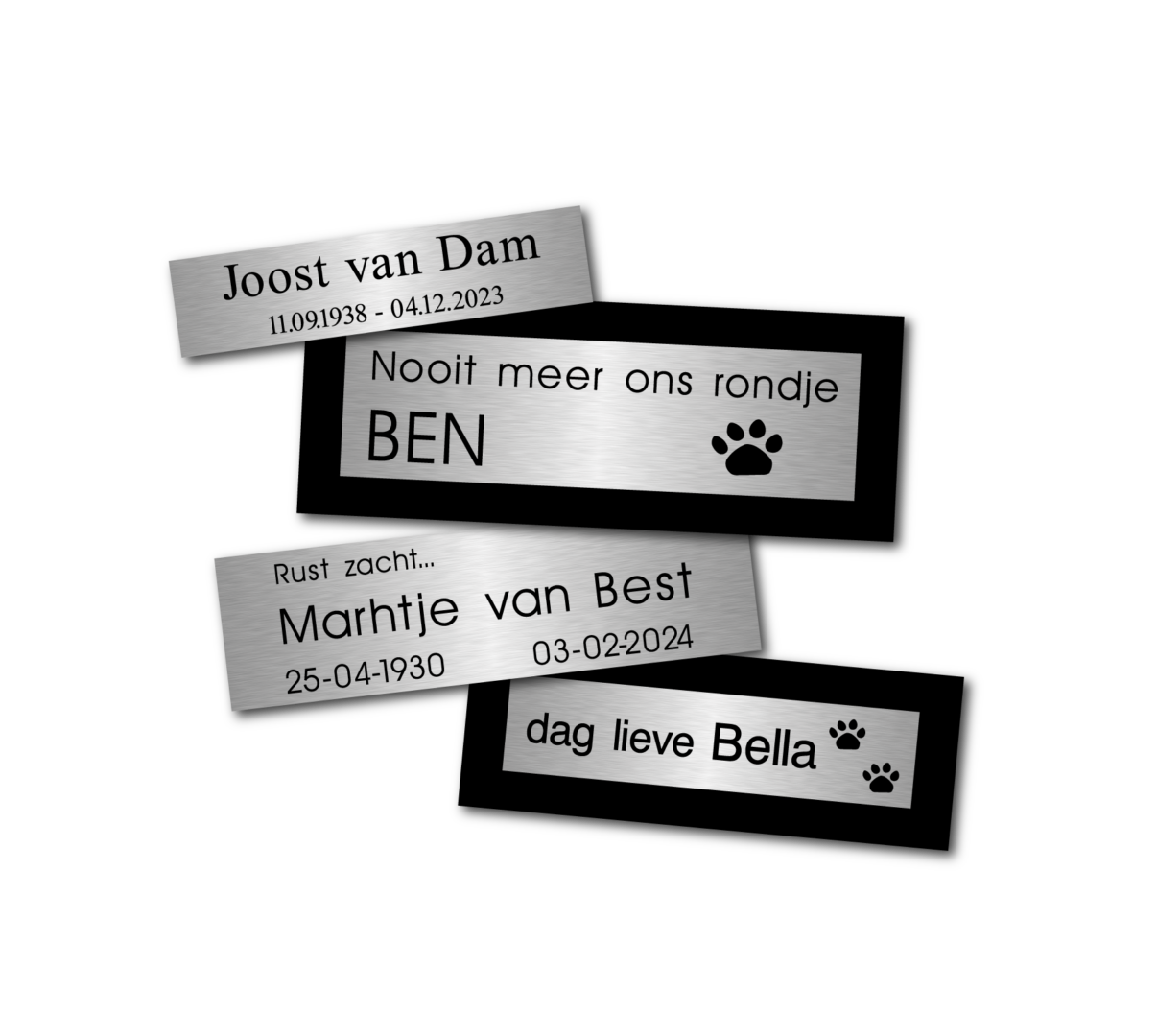 Ontdek onze elegante RVS gedenkplaatjes, verkrijgbaar in twee maten – 8x2cm en 10xcm. Optioneel met een zwarte achterplaat voor een stijlvol contrast. Personaliseer met een keuze uit diverse lettertypen en illustraties, en laat uw herinneringen stralen met onze precisiegravure door middel van geavanceerde lasertechnologie. Een tijdloos eerbetoon aan dierbaren, speciale gebeurtenissen en geliefde huisdieren.