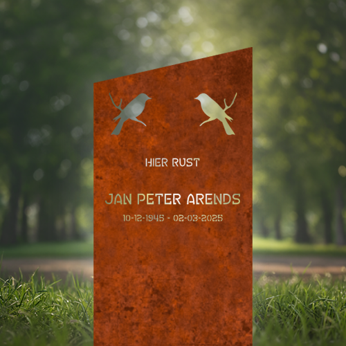 Cortenstaal is een duurzaam materiaal dat een beschermende patinalaag vormt. Deze natuurlijke roestlaag beschermt de gedenksteen tegen regen, wind en vorst. Hierdoor blijft het monument jarenlang mooi zonder dat onderhoud nodig is – een zorgeloze en duurzame keuze.